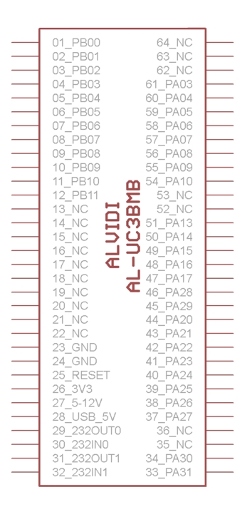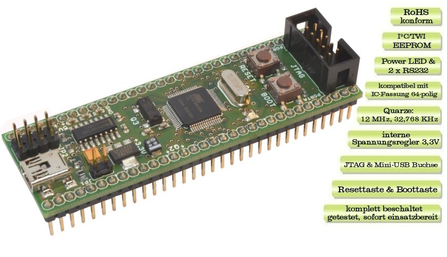 Aufbau: - Controller: Atmel AVR32 AT32UC3B0256 bis 60 MHz - Ausstattung: • interner Spannungsregler 3,3V • I²C/TWI EEPROM 8KByte • RS-232 Transceiver - Spannungsversorgung: • externe 3,3V oder • externe 5,0-12V oder • USB 5V - Modulgrösse: B x H x T 27 mm x 83 mm x 19,3 mm - Betriebstemperatur: -20°C bis +70°C - Integrierte Quarz: • 12MHz • 32,768KHz • zusätzliche Quarz-Pins - PC-Anschluss: • Mini-USB oder • 2 x RS232, trennbar durch Jumpers - Kompatibilität: • kompatibel mit IC-Fassung 64-polig • Lochrasterplatine mit Rastermaß 2,54 mm - Schaltung: nach der Empfehlung des Herstellers aufgebaut - Programmierung: • JTAG MKII Buchse oder - Pinbelegung des AVR32-Moduls: in der linken Abbildung dargestellt - Pinbelegung JTAG und USB Buchse: • JTAG Buchse 10-polige, Standard von Atmel • Mini-USB Buchse 5-polig Typ B - Funktionalität: getestet, sofort einsatzbereit - Konformität: RoHS konform - Hergestellt in Deutschland Controller: - Atmel AVR32 AT32UC3B0256 - 256K Bytes Flash - 32K Bytes Int. SRAM - 44 x Prog. I/O Lines - 8 x ADC Channels - 7 x PWM Channels - 3 x Serial USARTs - 3 x 16-bit Timer/Counter - USB 2.0 Full Speed - Internal Oscillator - SPI und TWI - 0 - 60 MHz - 3.3V - mehr ... Beschreibung: Wir bieten Ihnen mehr Flexibilität bei der Entwicklung. Das AVR32-Modul ist komplett nach der Empfehlung des Herstellers Atmel aufgebaut. Wir haben dafür gesorgt, dass alle Pins des Controllers zur Verfügung stehen und diese in logischer Reihenfolge zugeordnet sind, um die Arbeit bei der Entwicklung für Sie zu vereinfachen. Für die Spannungsversorgung stehen folgende Möglichkeiten zu Ihrer Wahl: USB Spannung von 5V, externe Spannung von 3,3V oder externe Spannung 5 – 12 V. Das AVR32-Modul ist mit zwei Quarzen 12 MHz und 32,768 KHz ausgestattet und kann mit dem Dritten ausgerüstet werden. Als Zusatz wurde 8Kbyte I2C/TWI EEPROM angebracht. Zur Programmierung des Controllers ist einmal JTAG MKII Buchse angebracht und zum anderen USB Buchse. Jedes AVR32-Modul ist mit dem Bootloader von Atmel programmiert. Bootloader ist eine kostenlose Programmiermöglichkeit. Damit diese Möglichkeit Ihnen Zur Verfügung steht, haben wir für die entsprechende Erweiterungen des Moduls gesorgt. Das AVR32-Modul ist zusätzlich mit RS232-Transceiver ausgestattet. Die UARTPins des AVR32-Controllers sind mit dem Transceiver verbunden. Sie können durch die Jumpers getrennt werden. Ob für Einsteiger oder fortgeschrittene Entwickler bieten wir sehr einfache Installation und Umgang mit dem AVR32-Modul an. Lieferumfang: - 1x AVR32-Modul mit EEPROM (getestet und sofort einsatzbereit), - 5x Jumpers und - Rechnung mit 2 Jahre Garantie (und ausgewiesener MwSt) Links: