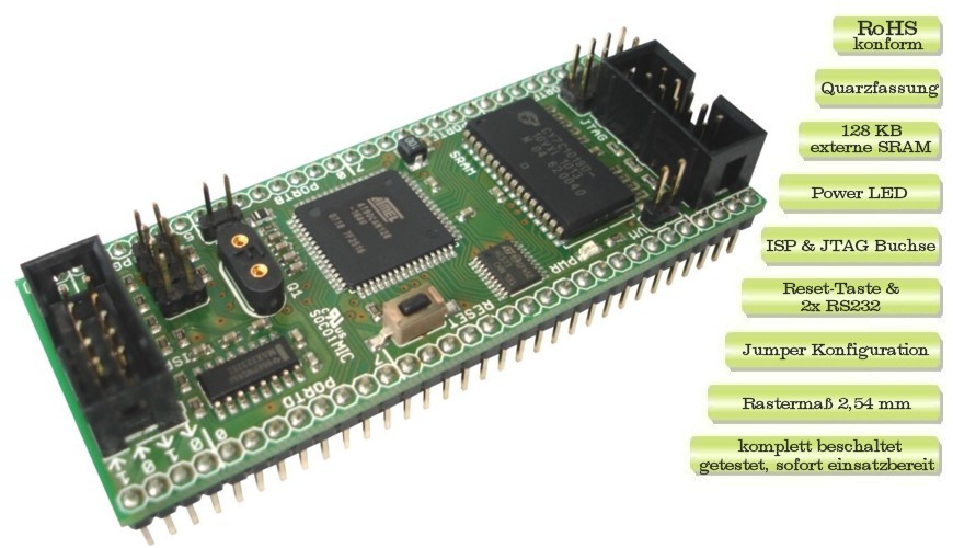 Aufbau: - Controller: Atmel AVR AT90CAN128-16AU bis 16 MHz - Ausstattung: • externe SRAM 128 KByte • mit Reaktionszeit 10 ns • RS-232 Transceiver • Reset-Taste • Power LED - Externe SRAM: interne oder externe Spannung - Spannungsversorgung: 5V - Modulgrösse: B x H x T 34 mm x 83 mm x 19,3 mm - Betriebstemperatur: -40°C bis +85°C - Quarzfassung: leichte und schnelle Quarzaustausch - PC-Anschluss: 2 x RS232, trennbar durch Jumpers - Kompatibilität: Lochrasterplatine mit Rastermaß 2,54 mm - Schaltung: nach der Empfehlung des Herstellers aufgebaut - Programmierung: ISP oder JTAG Buchse oder BOOTLOADER - Pinbelegung des AVR-Moduls: in der linken Abbildung dargestellt - Pinbelegung ISP & JTAG Buchsen: 10-polige, Standard von Atmel - Funktionalität: getestet,sofort einsatzbereit - Konformität: RoHS konform - Hergestellt in Deutschland Kostenlos: ein Quarz auf Wunsch