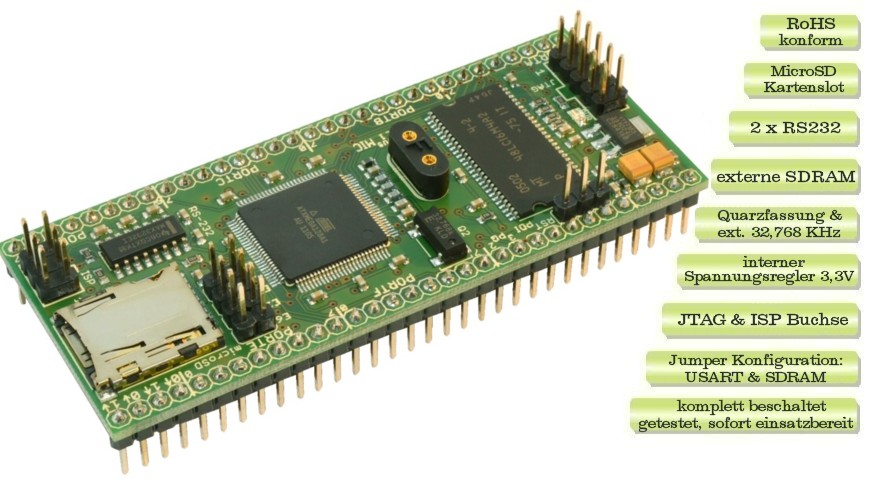 Aufbau: - Controller: Atmel AVR ATxmega128A1U-AU bis 32 MHz - Ausstattung: • interner Spannungsregler 3,3V • externe SDRAM 64Mbit • MicroSD Kartenslot • RS-232 Transceiver • Power LED - Spannungsversorgung: • externe 3,3V oder • externe 5,0-12V - Modulgrösse: B x H x T 34 mm x 83 mm x 19,3 mm - Betriebstemperatur: • -25°C bis +85°C mit microSD Kartenslot • -40°C bis +85°C ohne microSD Kartenslot - Externer Quarz: • Quarzfassung • externer 32,768KHz Quarz - PC-Anschluss: 2 x RS232, trennbar durch Jumpers - Kompatibilität: Lochrasterplatine mit Rastermaß 2,54 mm - Schaltung: nach der Empfehlung des Herstellers aufgebaut - Programmierung: • JTAG MKII Stiftleiste oder • AVR ISP MKII Stiftleiste - Pinbelegung ISP & JTAG: • ISP(PDI) 6-polige Stiftleiste, Standard von Atmel • JTAG 10-polige Stiftleiste, Standard von Atmel - Pinbelegung des AVR-Moduls: in der linken Abbildung dargestellt - Funktionalität: getestet, sofort einsatzbereit - Konformität: RoHS konform - Hergestellt in Deutschland Kostenlos: ein Quarz auf Wunsch