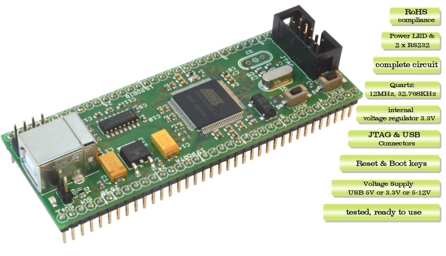 Construction: - Controller: Atmel AVR32 AT32UC3A1512 up to 66 MHz - Equipment: • linear voltage regulator 3.3V • reset and boot key • Power LED • JTAG interface • USB interface • RS232 driver • 2x quartz and 1x additional quartz place • 63x external I/O - Voltage Supply: • external 3.3V • external 5.0-12V • USB 5V - Module size: W x H x D 34.2 mm x 92.5 mm x 20.2 mm - Operating temperature: -40°C up to +85°C - Quartz: • 12MHz, • 32,768KHz, • additional quartz place - Interfaces: • USB • JTAG • RS232 - Compatibility: compatible with hole matrix board 2.54 mm - Circuit: built on the recommendation of the manufacturer - Programming: • JTAG connector (10-pin) or - Pin configuration of AVR32-Module: shown at the left picture - Pin configuration JTAG: 10-pin, standard of Atmel - Functionality: tested, ready to use - Conformity: RoHS Compliance - Produced in Germany Controller: - Atmel AVR32 AT32UC3A1512 - 512K Bytes Flash - 64K Bytes Int. SRAM - 69 x Prog. I/O Lines - 8 x ADC Channels - 7 x PWM Channels - 4 x Serial USARTs - 3 x Timer/Counter - USB 2.0 Full Speed - Ethernet MAC 10/100 - Internal Oscillator - SPI und TWI - 0 - 66 MHz - 3.3V - more ... Description: We offer you more flexibility by the development. The AVR32 module is completely built on the recommendation of the manufacturer Atmel. We have provided for the fact that all pins of the controller are available and are assigned in logical order to simplify the development for you. There are following options for power supply to your choice: USB voltage of 5 V, external voltage of 3.3 V or external voltage between 5 – 12 V. The AVR32 module is equipped with two quartz 12 MHz and 32.768 kHz and may be equipped with the third one. JTAG MKII and USB connector are installed to program the controller. Every AVR32 module is programmed with the boot loader of Atmel. Boot loader is a free program alternative. We have provided for the suitable extensions of the module, in order to make this option available to you. Additionally the AVR32 module is equipped with RS232-transceiver. The UART-pins of the AVR32 controller are connected with the transceiver. They can be separated by the jumpers. We offer you a very simple installation and use of AVR32-Module for the beginner as well as for the advancer. Scope of delivery: - 1x AVR32-Module (preconfigured, tested and ready to use), - 5x Jumpers and - invoice with 2 years guarantee Links: |