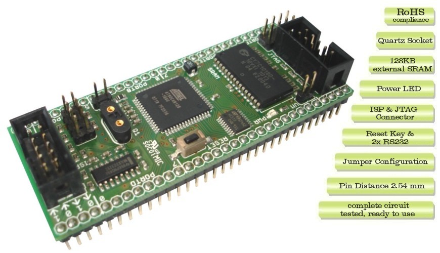 Construction: - Controller: Atmel AVR AT90CAN128-16AU up to 16 MHz - Equipment: • 128K Bytes external SRAM • with 10 ns speed • RS-232 Transceiver • Reset key • Power LED - External SRAM: internal or external voltage - Supply voltage: 5 V - Module size: W x H x D 34 mm x 83 mm x 19.3 mm - Operating temperature: -40°C up to +85°C - Quartz socket: simple and fast quartz exchange - PC-Connection: 2 x RS232, separable with jumpers - Compatibility: compatible with hole matrix board (hole distance 2.54 mm) - Circuit: built on the recommendation of the manufacturer - Programming: ISP or JTAG connector or BOOTLOADER - Pin configuration of AVR-Module: shown at the left picture - Pin configuration ISP & JTAG connectors: 10-pin, standard of Atmel - Functionality: tested, ready for use - Conformity: RoHS Compliance - Produced in Germany - Free of charge: one desired quartz inclusive