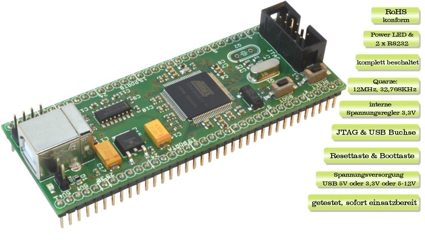 Aufbau: - Controller: Atmel AVR32 AT32UC3A1512 bis 66 MHz - Ausstattung: • linearer Spannungsregler 3,3V • Reset und Boot Taste • Power LED • JTAG Schnittstelle • USB Schnittstelle • RS232 Treiber • 2x Quarze und zusätzliche Quarzstelle • 63x externe I/O - Spannungsversorgung: • externe 3,3V • externe 5,0-12V • USB 5V - Modulgrösse: B x H x T 34.2 mm x 92.5 mm x 20.2 mm - Betriebstemperatur: -40°C bis +85°C - Quarz: • 12MHz, • 32,768KHz, • zusätzliche Quarzstelle - Schnittstellen: • USB • JTAG • RS232 - Kompatibilität: Lochrasterplatine mit Rastermaß 2,54 mm - Schaltung: nach der Empfehlung des Herstellers aufgebaut - Programmierung: • JTAG Stiftleiste (10-polig) oder - Pinbelegung des AVR32-Moduls: in der linken Abbildung dargestellt - Pinbelegung JTAG Buchse: 10-polige, Standard von Atmel - Funktionalität: getestet, sofort einsatzbereit - Konformität: RoHS konform - Hergestellt in Deutschland Controller: - Atmel AVR32 AT32UC3A1512 - 512K Bytes Flash - 64K Bytes Int. SRAM - 69 x Prog. I/O Lines - 8 x ADC Channels - 7 x PWM Channels - 4 x Serial USARTs - 3 x Timer/Counter - USB 2.0 Full Speed - Ethernet MAC 10/100 - Internal Oscillator - SPI und TWI - 0 - 66 MHz - 3.3V - mehr ... Beschreibung: Wir bieten Ihnen mehr Flexibilität bei der Entwicklung. Das AVR32-Modul ist komplett nach der Empfehlung des Herstellers Atmel aufgebaut. Wir haben dafür gesorgt, dass alle Pins des Controllers zur Verfügung stehen und diese in logischer Reihenfolge zugeordnet sind, um die Arbeit bei der Entwicklung für Sie zu vereinfachen. Für die Spannungsversorgung stehen folgende Möglichkeiten zu Ihrer Wahl: USB Spannung von 5V, externe Spannung von 3,3V oder externe Spannung 5 – 12 V. Das AVR32-Modul ist mit zwei Quarzen 12 MHz und 32,768 KHz ausgestattet und kann mit dem Dritten ausgerüstet werden. Zur Programmierung des Controllers ist einmal JTAG MKII Buchse angebracht und zum anderen USB Buchse. Jedes AVR32-Modul ist mit dem Bootloader von Atmel programmiert. Bootloader ist eine kostenlose Programmiermöglichkeit. Damit diese Möglichkeit Ihnen Zur Verfügung steht, haben wir für die entsprechende Erweiterungen des Moduls gesorgt. Das AVR32-Modul ist zusätzlich mit RS232-Transceiver ausgestattet. Die USART Pins des AVR32-Controllers sind mit dem Transceiver verbunden. Sie können durch die Jumpers getrennt werden. Ob für Einsteiger oder fortgeschrittene Entwickler bieten wir sehr einfache Installation und Umgang mit dem AVR32-Modul an. Lieferumfang: - 1x AVR32-Modul (vorkonfiguriert, getestet und sofort einsatzbereit), - 5x Jumpers und - Rechnung mit 2 Jahre Garantie (und ausgewiesener MwSt) Links: